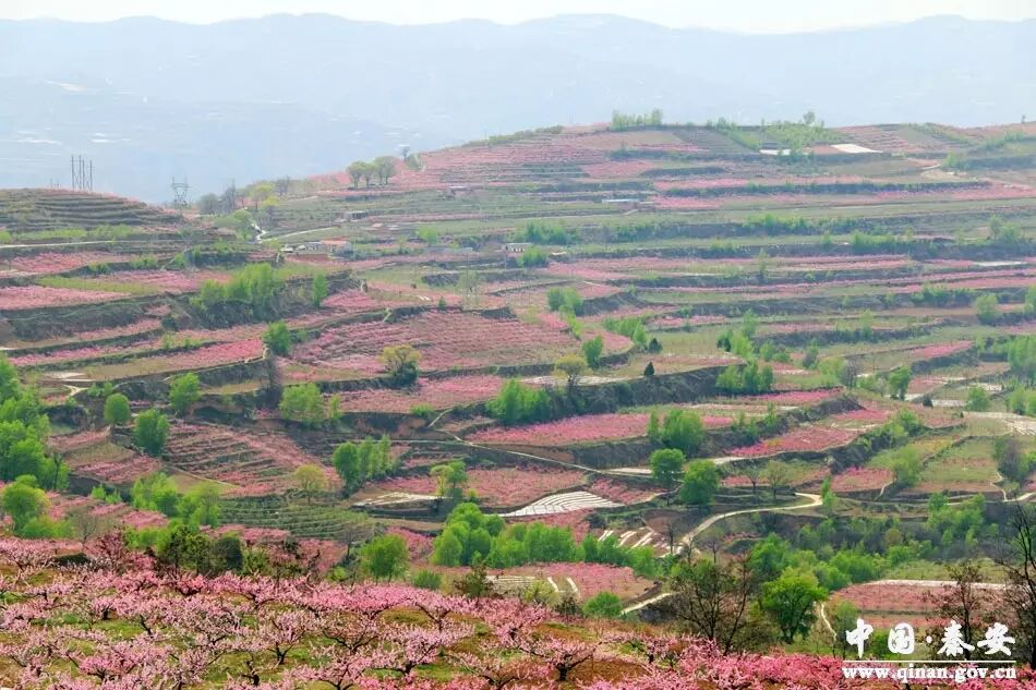 每年四月,在秦安县葫芦河两岸的山川大地上,桃花烂漫,姹紫嫣红,万亩桃花竞相绽放,随着山势绵延起伏,如霞落大地、纱披山岗,又如花海泛波、美不胜收。